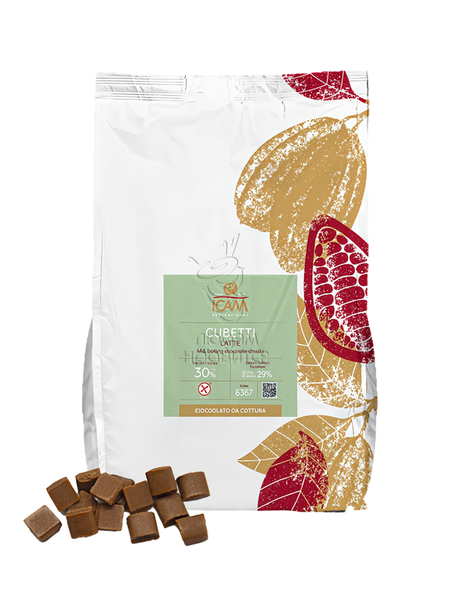 Молочный шоколад кусочками для кондитерских Milk chocolate Chunks отличается своей устойчивостью к высокой температуре приготовления продуктов, неправильная форме кубиков специально предназначена для хлебобулочных изделий.